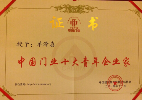 群喜门业总经理单泽喜荣获中国门业十大青年企业家称号