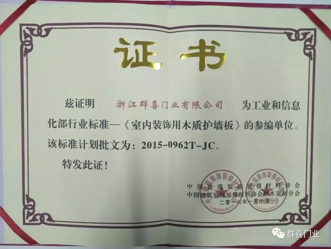行业标准《室内装饰用木质护墙板》参编浙江群喜门业有限公司。